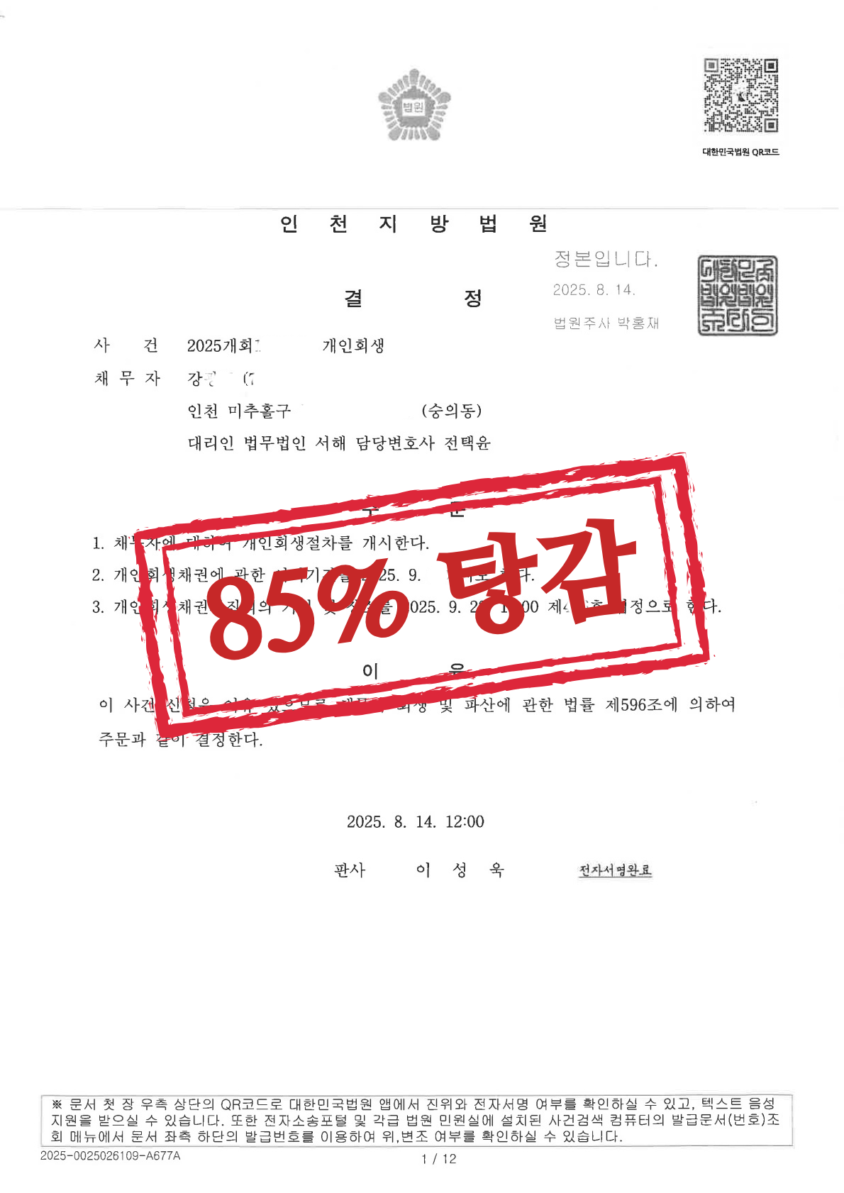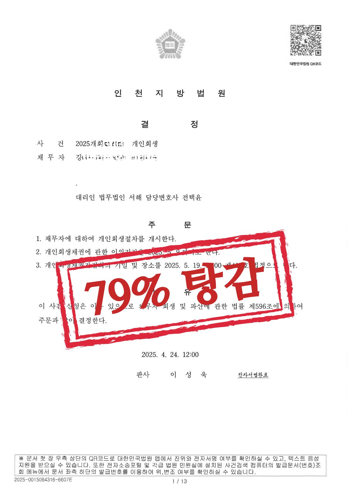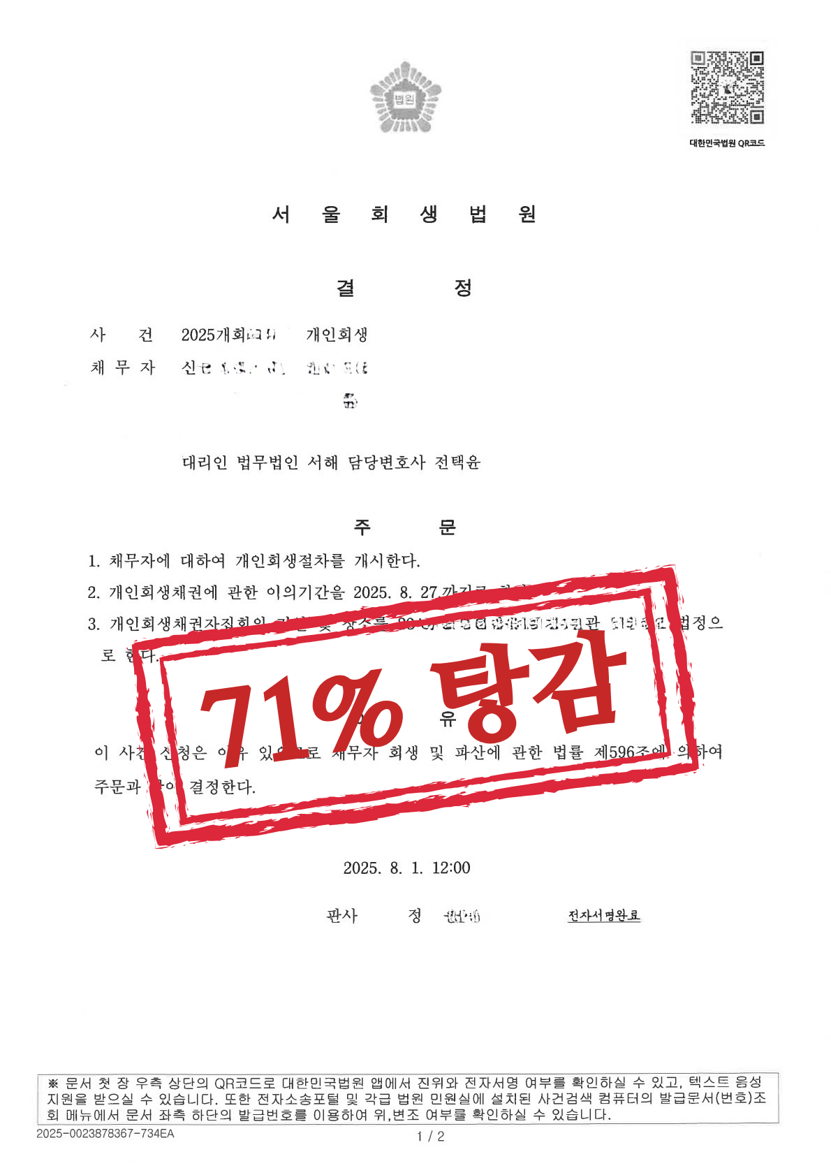 사건 접수 후 통상 3~7일 이내에 법원의 금지명령이 떨어집니다. 금지명령이 내려지면 채권자들의 빚 독촉, 압류, 경매 등 모든 추심 행위가 법적으로 금지되어 평온한 일상을 되찾으실 수 있습니다.